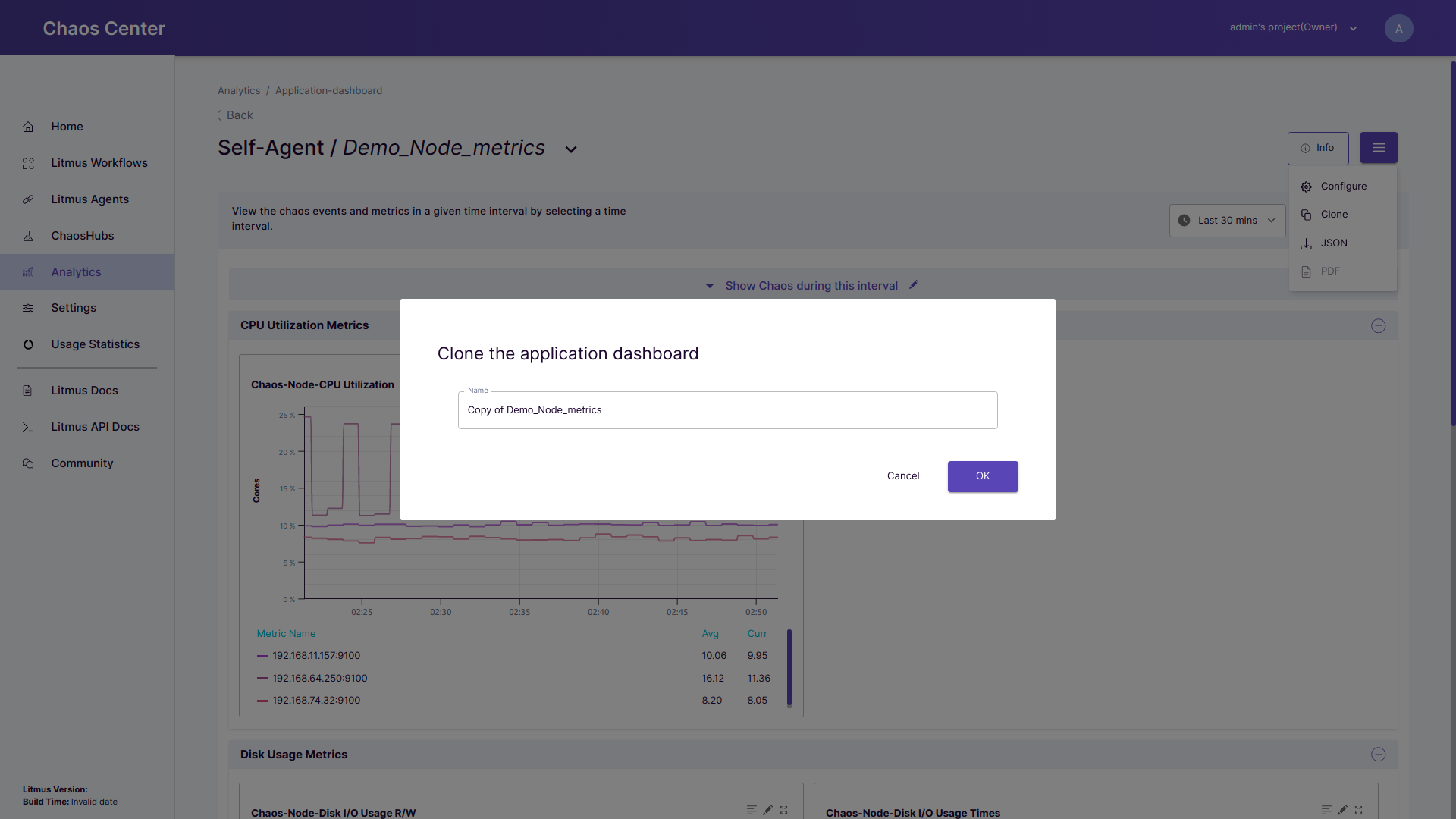 Clone: To make a copy of the current dashboard click on the clone button. Enter new name of the dashboard and click on