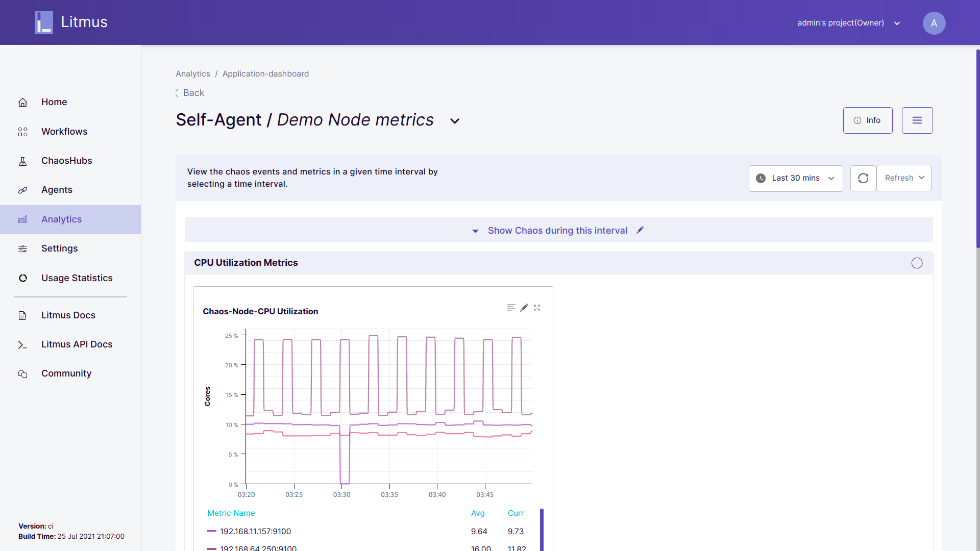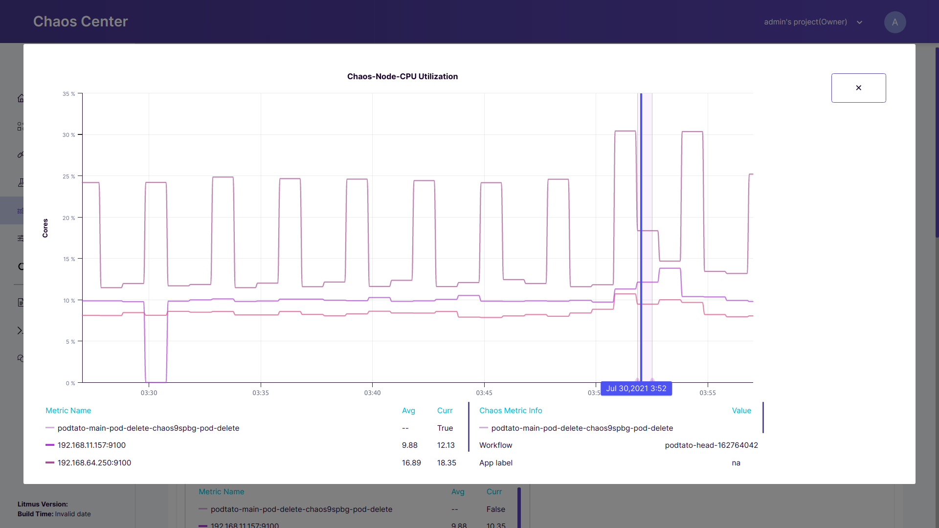 View chaos metric info: For the particular graph, if you want to view the chaos scenario -related information in the table then you may first expand the graph and hover over the specific chaos event to view all its chaos scenario -related information.
