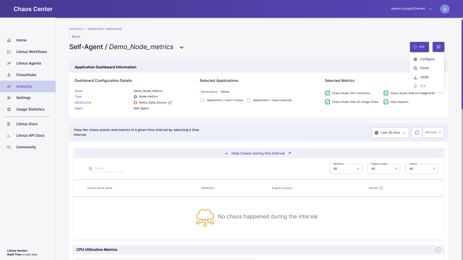 - Dashboard Info: All the dashboard meta-data (name, type, data source, chaos delegate ), selected applications and selected panels are displayed in this selection. To check on the data source connected with the dashboard click on the attached data source link. You may select/deselect the items listed in the selected applications and selected panels field to visualize the appropriate data.
